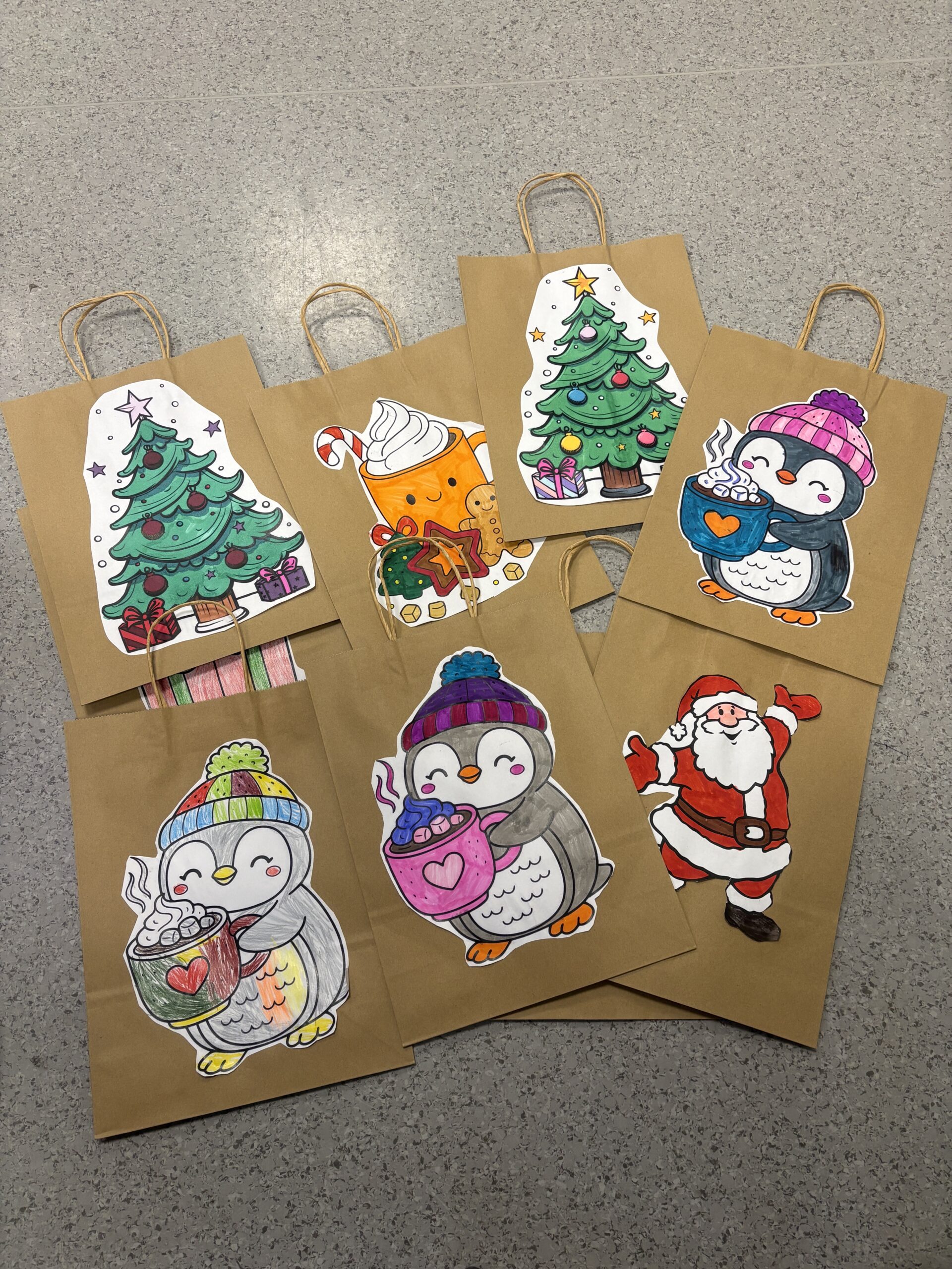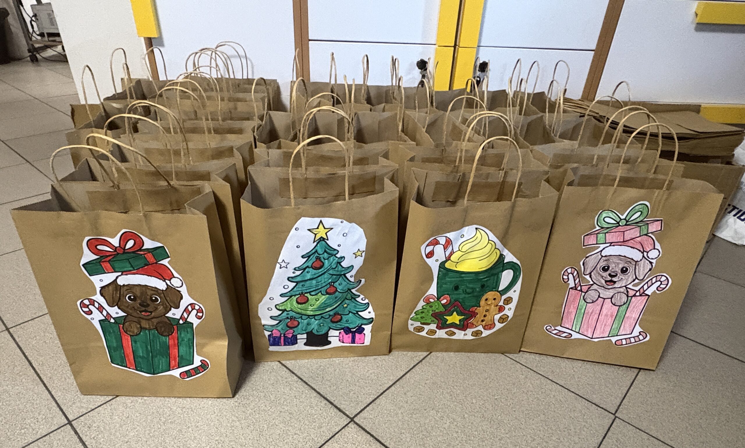 🤍 Uczniowie z klasy „0” przygotowali piękne, kolorowe obrazki, które zostały naklejone na szare torby. Dzięki temu każda paczka stała się wyjątkowa i pełna dziecięcej radości 🎨🖌️