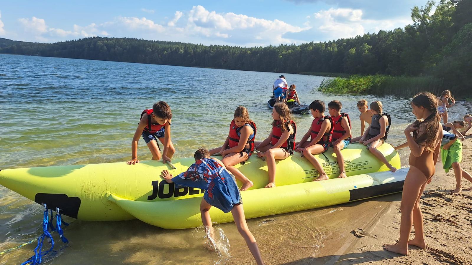 Podczas pływania na bananie za motorówką liczyła się równowaga i współpraca, bo tylko razem mogliśmy utrzymać się na fali.👍